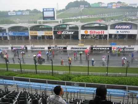 | 7:19 降り始めました。 スタート前のチェックをする、少し前からポツリポツリと雨粒が落ち始めました。 ただ、これが本格的な雨になるか、すぐにやんでしまうのか、判断が出来ません。 最悪はサイティングラップ後、グリッドに並んでからタイヤの交換をすることに!(それだけは避けたい) |