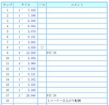 8:30-9:00 1走行目 1走行目。コースインして路面の状況を確認します。 ラインを外れると濡れたところが少し残っていますが、ライン上は乾いていて大丈夫そう、確認しました。 早い段階でとりあえず、タイムを出しに行きます。 1ヘアピンの立ち上がで2速のまま、ダンロップ下に進入して、そのままMCコーナーの右、そして切り返して左と、良い感じです。 今までより楽に走ることが出来、2ヘアまでの巧く加速していくことが出来ます。 この乗り方は楽です。 ただし、ダンロップ下を2速で回るとエンジンの回転が高いので、気を付けないとエンジンブレーキがかかって車速が必要以上に落ちてしまうので、要注意です。 8周目に4秒台に入ってので、いったんピットに入ります。 今日はちょっとスタミナがありません。 来週のレースが15周回ですので、この周回でバテていると、ちょっとまずいですね。 |