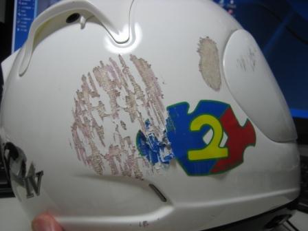 | ちょっと休んで再度コースインをします。 途中からスクリーンがちょっと水粒が着く程度の霧雨が降ってきました。 路面はまったく問題なくドライです。 ちょっとペースを落としてMCコーナーの練習をしつつ周回します。 ちょっと霧雨が気になるので、17周回目に再度ピットイン。 ピットインするとほとんど雨はふっていなかったので、再度コースイン。 ゴールポストでチェッカーを振る準備をしていたので、最終のタイムアタックをします。 1コーナー立ち上がりで、アクセルを開けすぎ、リヤがスライド、一度はスライドが止まりましたが、転倒!!! 頭を打ったため、脳しんとうでその後は覚えていません。 右のステップがかなり短くなっちゃいましたぁ。(T_T) |