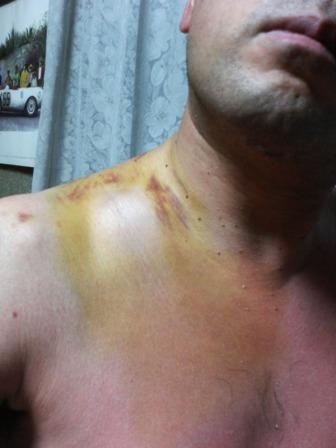 結局、1コーナーの立ち上がりで転倒して、頭を打って記憶がないまま、八千代病院に搬送。 そこで、記憶が戻りました。 実際、後日青木さんに聞くまで、自分が1コーナーで転倒したのか、MCコーナーの1個目の右で転倒したのか記憶がありませんでした。 転倒の結果、右肺に穴が開いて、そこから空気が漏れて、あばら骨との間に空気が入り込む”気胸”と言う状態になりました。 この気胸、状態が悪くなると肺が圧迫されてつぶれてしまい、呼吸困難に陥るそうで、そうなった場合、あばらに穴を開けてそこから空気を抜くそうです。 悪化する危険があったので、筑波サーキット至近の八千代病院から、救急車で筑波メディカルセンターに転送されました。 でも、自分はそこまで悪くはならず、自然に治癒するレベルで止まりました。 |