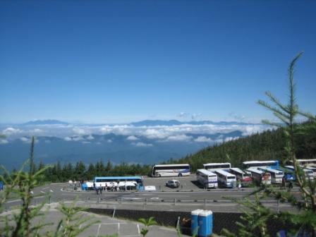 | 9:54 富士山五合目に到着 マイカー規制中のため、ガラガラの富士スバルラインを快適に登り標高2,305mの五合目まできました。 目の高さが雲よりも”ちょっと上”と言ったポジションです。 |