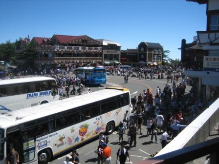 | 10:28 五合目は人だらけ 五合目の広場はバスツアーや路線バスでやってきた人間でごった返していました。 『なんでこんなに混んでいるんだろう』 と思う自分もその1人。 |