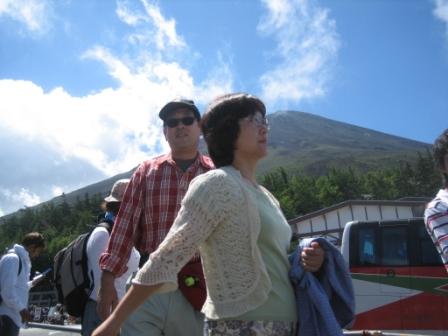 | 10:48 お〜〜いっ! 登山前に五合目から富士山をバックに三脚を使ってタイマー撮影で写真を1枚。 と思ったら、思いっきり前を歩いていくオバさん。 『お〜〜いっ!普通気がつくだろう。写真取ってるの!(怒)』 (他がないのでそのまま掲載(-_-)) |