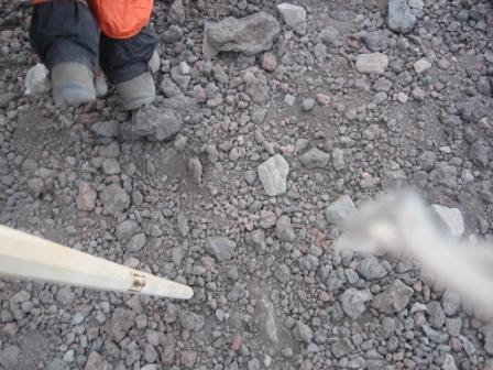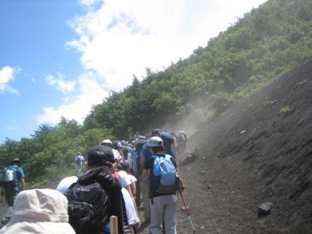 | 11:54 砂ぼこり 五合目から歩き出すと、小石混じりの火山灰土の登山道が続きます。 沢山の人が歩く+風が吹くので、すごい砂ぼこりです。 軽く汗ばんだ顔に砂が付着して、顔はすぐに真っ黒になります。 |