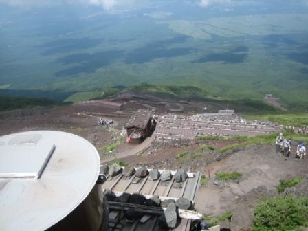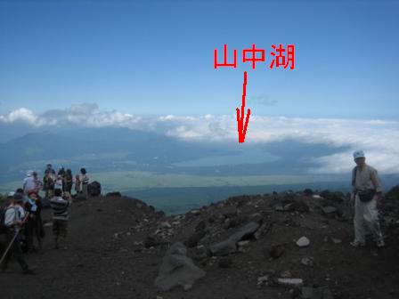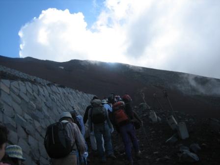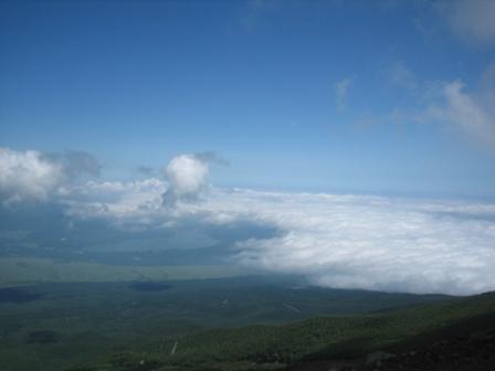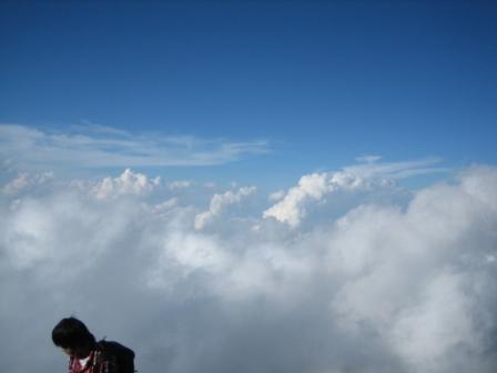 | 16:17 雲の上を 登山は雲の上を歩いて行きます。 左下の隅に写っているのはガイドさん。 学生バイトですが、2日に1回、新宿から富士山の八合目までお客さんを連れて登ります。 バイトとはいえ、ご苦労さんです。<(_ _)> |