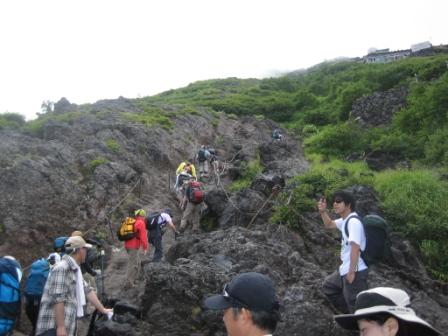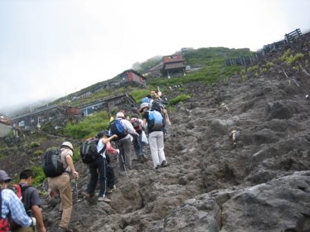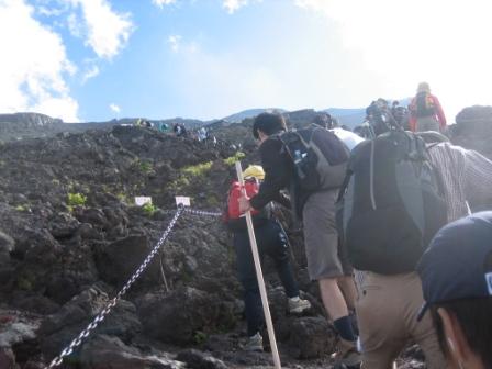 | 13:33 まだ登ります 七合目の山小屋で休憩して、まだまだ登山は続きます。 ここから上は結構急な岩場があったりします。 空気もかなり薄くなってきて、軽くふらふらとします。 脳が酸欠状態になり、あくびが出て眠気がします。 |