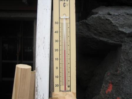 | 14:09 気温20℃ 標高約2,800m、山小屋の温度計は20℃です。 ただ、日光をさえぎるものが何もないので、首の後ろがジリジリと焼けるのがわかります。 熱中症対策のため、帽子は必須ですね。 |