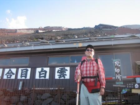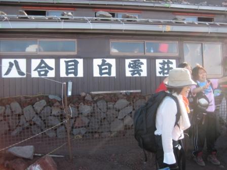 | 16:36 到着 登山開始から約5時間半、山小屋に到着しました。 記念に山小屋のおばちゃんに写真を撮ってもらいました。 けど、大事な”八合目”の”八”の字が写ってませんし、”白雲荘”の”荘”の字も写ってません。 ダメだこりゃ。 と言うことで、再度自分で写真を撮り直しました。 ”八合目 白雲荘” |