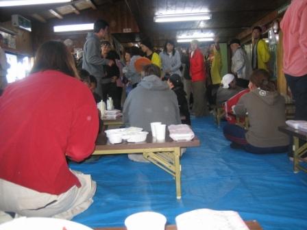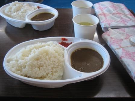 | 16:59 夕食? 到着するとまずは寝る場所に案内され、その後すぐに夕食です。 まだやっと5時です。 頂上でご来光を見るには、1時には起床しなければならないので出来るだけ早く夕食を食べるのが正解。 で、夕食はご覧の通りカレー&お茶。山小屋の食事です。 普通、富士山以外の山小屋は沢や湧き水があるところに山小屋を建てることが多いそうですが、富士山上部には沢や湧き水が無いため、水はとっても貴重です。 なので、お茶のお代わりは許されません。(笑) 今回、女の人の参加者が半分近くいましたが、食事後山小屋の人に『顔を洗いたいんですが・・・?』と質問していましたが、ありません! 唯一自由になる水はトイレの手洗い水。 (食事中に失礼!) ただし、雨水をためたものなので、飲めません。 雑菌があるかもしれないので、顔も洗えません。 ちなみに、500mlのペットボトルのミネラルウォータを売っていますが、¥500でございました。 話は戻って、下の写真は朝食のお弁当。 中身は赤飯&ミートボール2個、漬け物でした。 |