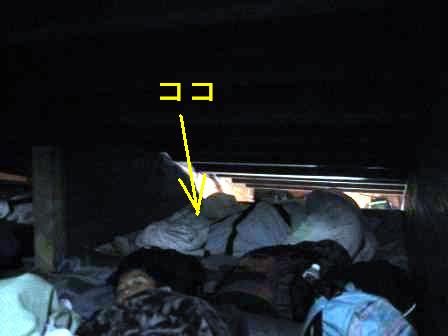 | 17:22 寝床 夕食後、寝床へ。 当然相部屋。 で、自分の寝床は写真奥。 幅1.8m×長さ1.8mの空間に4人が寝ます。 って言うことは、1.8m÷4 → 1人=幅45cm。 覚悟はしていましたが、45cmと言う幅は隣どおしと肩がふれあって寝ることに・・・。 ちなみに、1人で参加した自分の両脇はおじさんでした。 (年齢的に自分もおじさんですが(^^;) しかも、この場所が最悪で、屋根裏の斜めの部分で高さが全然ありませんでした。 そのため布団の上に座ることも出来ないので、荷物の整理も出来ず、寝ること(?)しか出来ませんでした。 (正確には”寝ること”ではなく”横になること”しか出来ませんでした) |