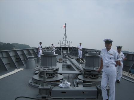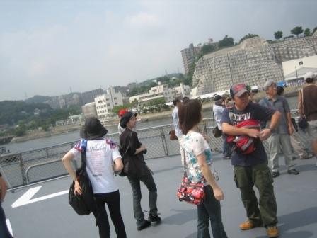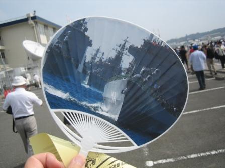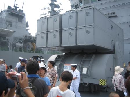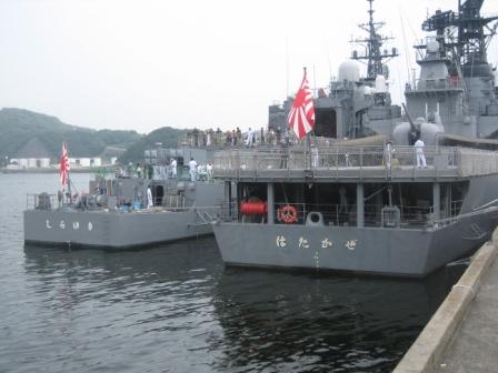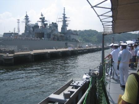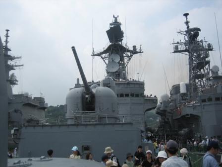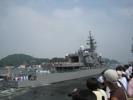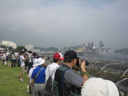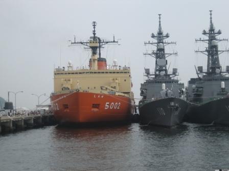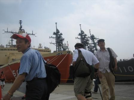 | 9:42 船が見えてきました。 埠頭に船が見えてきました。 一番左側に写っているのは、南極観測船の”しらせ”。 南極観測船は、文部科学省でも環境省の管轄でもなく、防衛省の持ち物だったんですね。(知ってました?) で、二番目、三番目は護衛艦、で一番右はアメリカ海軍のイージス艦。今回特別参加みたいです。 |