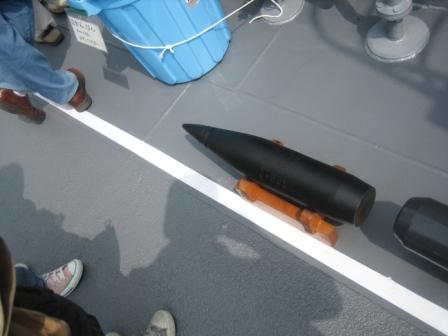 | 10:05 弾丸 5インチ砲の弾丸だそうです。 重さが約30kg、1分間に35発撃てるそうで、1分間打ち続けると、30kg×35発=約1トンの弾が飛んでいくのかぁ。 しかも、最大射程24km。 危ないなぁ。 |