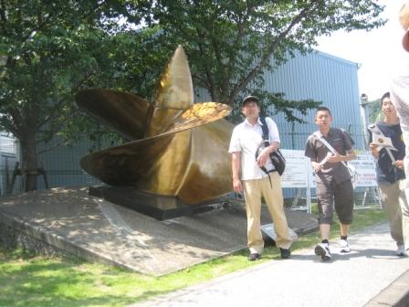 | 12:21 ぼちぼち 暑いので、帰ります。 最後に入口の脇にあったスクリュー(実物)の前で記念写真。 |