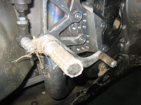 | 18:59 ステップ周り 今回一番ひどかったのが、このステップ周り。 ステップは思いっきり削れて、長さが2/3位になっちゃっています。 これも交換ですね。 スペアパーツに無いので、新品購入です。 あと、ブラケットのプレートも曲がって内側に入って、マフラーのエグゾーストパイプに当たっています、 |