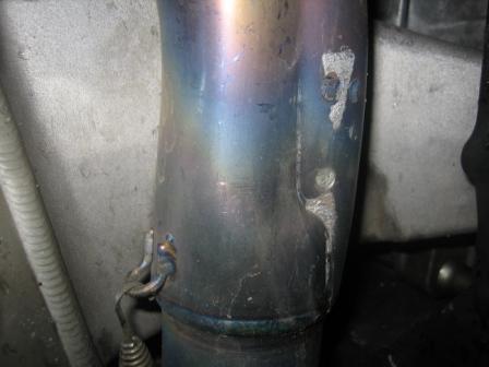 | 20:27 エグゾーストパイプ 曲がってエグゾーストパイプに当たっているブラケットのプレートを外したら、思いっきり当たってエグゾーストパイプにブラケットの形が・・・ もちろんブラケットは新品に交換です。 これも、スペアーにあったので、それを使います。 けど、エグゾーストはそのまま使います。 今のところは大丈夫、もしかして、使っていたらクラックが入るかもしれませんが、そうなったら直します。^^; |