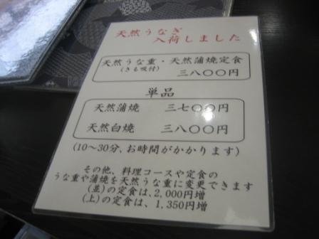 | 12:00 今日は 今日は”養殖もの”だけじゃなく”天然うなぎ”も入荷しているらしくお店の人に薦められました。 お品書きをみると、予想通りやはり高いですね。(^_^;) 天然うなぎは冬場はうなぎが寝ていて採れないそうで、この季節のものだそうです。 |