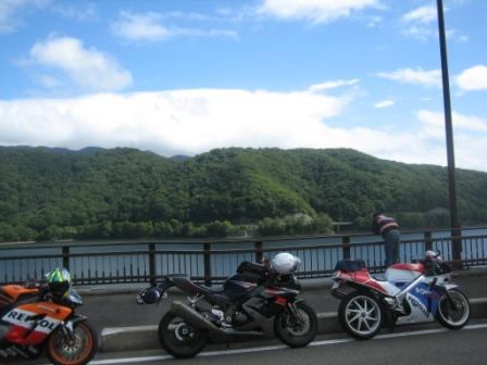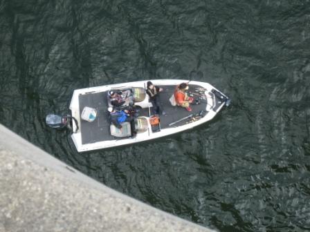 11:18 橋の上で休憩? 途中、檜原湖にかかる橋の上で休憩? 橋の上から見下ろすアイスエイジさん。 下には1艘のバスボートが・・・ 実はアイスエイジさんの釣り仲間の井上さんがバス釣りにきていました。 さっき、アイスエイジさんは井上さんと携帯でやりとりをして、この橋の下で待ち合わせをしていました。 (デジカメで撮ると間近の橋のコンクリート部分が曲がって写るんですね。) |