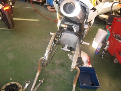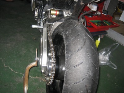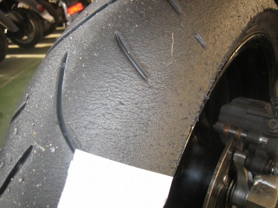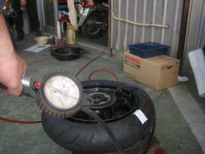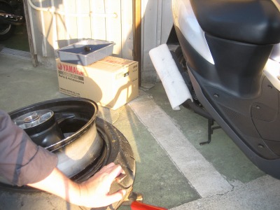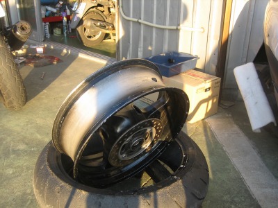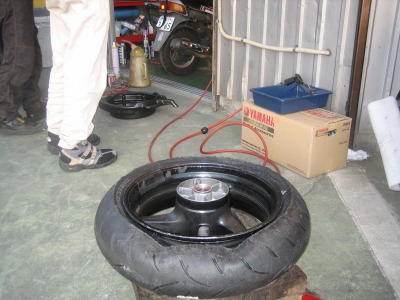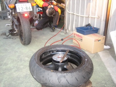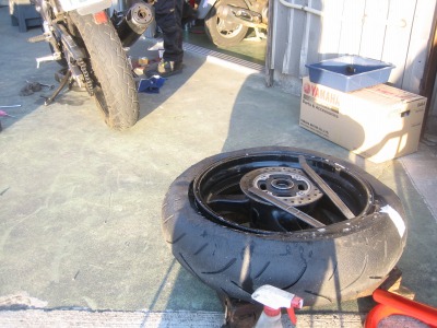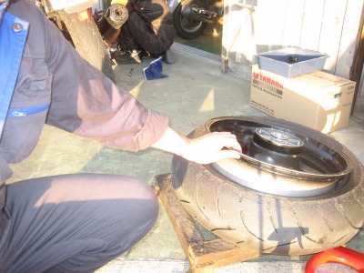 17:37 車体に装着 バランス取りが終わったら、タイヤをバイクに装着し、チェーンの張り具合の確認をして、リヤブレーキを踏んでパッドを密着させブレーキが効くのを確認して終わりです。 ついでに、チェーンの掃除と給油をしました。 この一連の作業、写真を撮りながらですが、時間かけすぎぃ。 昔、金の無い学生のときなどは、バイク屋さんに工具を借りて、みんな自分でタイヤ交換をしていました。 プロがやると簡単そうにタイヤ交換をしてしまうのですが、素人が自分でやるとこれがなかなか大変。 始めてやる素人がタイヤと格闘しながら交換しているのを端から見ると結構笑えたものです。 今は自分でやろうとする若い人もほとんど見なくなりました。 |