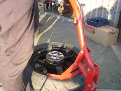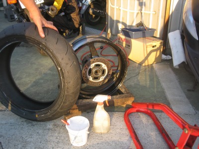 CBR600RRのメイテナンスは基本的に自分でやるようにしています。 (専用の工具が必要だったりするときはK2Yにご厄介になりますが) 今回はタイヤ交換。 頻繁にサーキット走行をするようになり、2〜3箇月に1回位はタイヤ交換をするようになりました。 ところが、毎回交換の手順を忘れてしまいます。 で、忘れないように今回はタイヤ交換の手順のレポを作成しました。 まさに自分のための備忘録です。(笑) 早速始めますが、後から写真でも分かり易い様に、タイヤの右側のバルブがある位置にガムテープを貼ってみました。 |