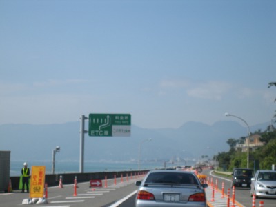 10:07 西湘バイパス 新湘南バイパスに上がり、終点の茅ヶ崎海岸ICまで進み、その後海っぱたの国道134号線を西走して、西湘バイパスに上がりました。 西湘バイパスは、先月9月6日に小田原付近に上陸した台風9号による高波で下り線が流され、9月末まで通行止めの状態でした。 現在は損害を受けた一部区間の上り線側を対面交通として、写真の様に片側1車線で使用しています。 |