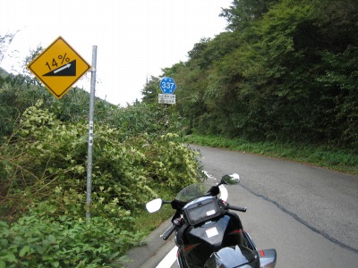14:51 県道337号線 林道の交差点からは県道337号仙石原新田線で湖尻峠を目ざし北上します。 この県道、看板にあるように上り勾配14%、かなりの急勾配、エビスの東コースの上りと同じくらいあります。(笑) |