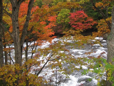15:34 竜頭の滝 竜頭の滝の上部に到着しました。 滝の両側の木々は見事に紅葉していました。 今週あたりが、ベストなタイミングの様です。(^_^)v 草木には興味がないので、名前が分かりませんが、赤・黄色、橙色に紅葉した葉と常緑樹の緑が混ざりあって、見事なコントラストです。 竜頭の滝は長さが約250mほどあり、上部と下部に駐車場があります。 今日は上部から下りてきましたが、途中で雨が降り始めましたので、引き返すことにします。 明日、天気が好転すれば、また来ることにします。 今日は寒いので少し早めに宿に入ることにします。 |