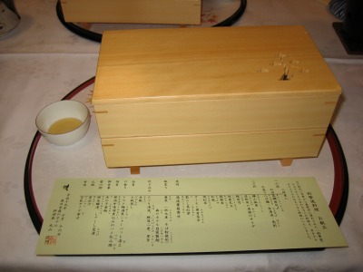18:06 二段重は 二段重の一段目(手前)は真鯛の菊花〆と馬刺し、生湯葉などのお造り、二段目(奥)は鱒の山椒煮や色々の料理が入っています。 食べる分にはもの足りませんが、非常に手が込んでます。 |