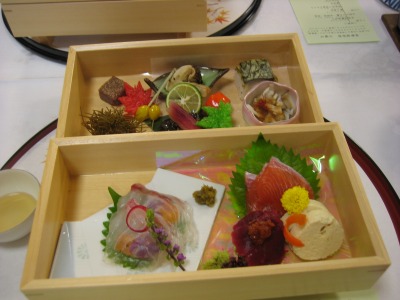 18:05 夕食です 入浴後、6時から夕食です。 (夕食は順番に出てくるので、全員そろって6時からです。時間を選べないのがちょっと不満) 今回は海外からのお客さんと言うこともあって、料理はちょっとはずんで、『例幣使料理プラン』を選びました。 まずは、二段重 |