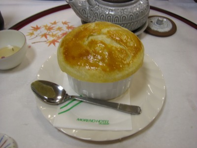 18:45 強肴 読み方が分かりませんが、牛肉の味噌煮込みパイ包み焼き。 牛肉が味噌味に柔らかく煮込んであって美味しいです。 パイの殻を破ると中から ほら 牛肉が現れます。 味噌仕立ての和風シチューですね。 |
