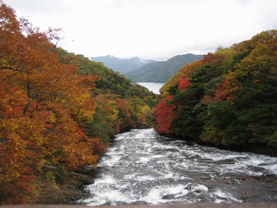 10:13 ふたたび竜頭の滝へ 昨日来た竜頭の滝にまたきました。 まずは竜頭の滝の上方から、中禅寺湖を望む位置で写真を一枚。 昨日は霧に霞んでいた中禅寺湖も、今日ははっきりと見ることができます。 竜頭の滝は戦場ヶ原から流れ出ており、滝を下った水は中禅寺湖へとそそぎます。滝の落差は約60m。 紅葉が見事です。 |