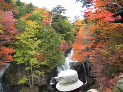 10:49 下側から 今度は、竜頭の滝の下側にきました。 下側から写真を一枚。とっ。 後から、見たら他の人の帽子が被ってました。 紅葉のベストタイミングの今、竜頭の滝周辺は沢山の人で溢れかえっていました。 |
