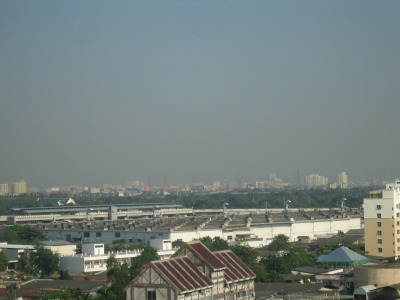 8:36 朝起きると 朝起きると空は曇っています。 気温は思ったより高くなく28℃くらい、歩いているとちょっと汗ばむ位です。 ホテルの窓からは、BTS(高架鉄道)のMo Chiit駅が見えます。 |