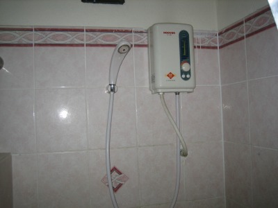 10:32 ホテルのシャワーは 今回泊まったクラスのホテルだと、当然バスタブはありません。 暑いからタイの人はバスタブに入る習慣が無いんでしょうね。 で、1年中暑いもんだから、水道の水もある程度温かい。 なので、このクラスのホテルだとシャワーもボイラーで炊いてお湯を循環しているなんてことはしないで、写真の様に手元に電気式の湯沸かし器を付けて、それでお湯を供給してます。 まあ、電気式でパワーが無いので熱いお湯なんて当然出ない、寒くない程度に暖まったお湯が出るだけ。 それがイヤな人は、外国人が宿泊する★★★★以上のホテルがお勧め。ただし、2,500THB以上はするかな? |