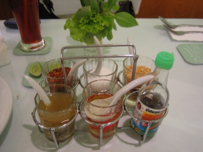 11:22 調味料セット タイ料理ではおなじみの調味料セット。 日本の食堂に置いてある、醤油、ソース、塩、コショウのセットと同じノリですね。 左手前から:?不明、手前中央:唐辛子入りのお酢(酸っぱい)、手前右:ナンプラー(魚醤)、奥左:ご存じ唐辛子(当然辛い)、奥中央:砂糖(当たり前だが甘い)、奥右:ピーナツ(パッタイにかけると美味しい) 普通はお酢、ナンプラー、唐辛子、砂糖の4点セットが出てきます |