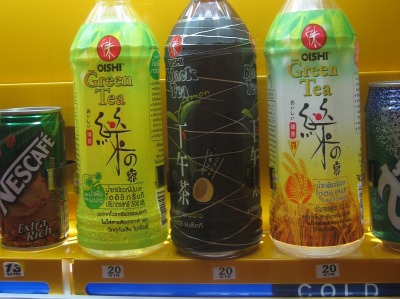 海外であまりは盗難や破壊などが多いため自動販売機を見かけることはないんですが、Centralデパート内にあったので、のぞいて見ると、緑茶のペットボトルが。 ”OISHI”と言うのはタイ人向けの日本食を出している会社のブランドで、タイの会社です。 500mlのペットボトルが20THB(約70円)と日本のほぼ半分の値段ですが、タイ人からすると高いと思うのだが・・・・ ちなみに、隣のNESCAFEは15THB約50円。とっても、とっても甘いです。 |
