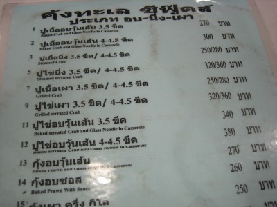 19:20 メニュー メニューは一応英語が並記してあるので、”エビ”とか”カニ”とか”サカナ”とか大体出てくるものは分かりますが、味付けがどうとか細かいことは分かりません。 と、言っても日本風の味付けはないので、何を頼んでも、基本はタイテースト。 |