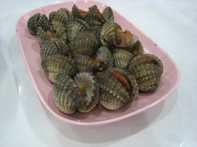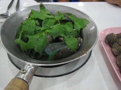 19:40 ムール貝の香草蒸し? かな? (正解はミドリイガイと言う種類だそうな。ムール貝の親戚) この時点では、軽い塩味が付いています。 これに、辛いソースをつけて食べます。 貝自体は淡泊な味で、味付けの大部分は辛いソースの味ですね。 (自分自身はあまり貝は好きでは無いので、まあ、1つ食べれば十分です) |