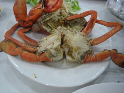 19:56 蒸し蟹 上のメニューを見ると、5番の”蒸し蟹”。 値段は360THB(約1,260円)、甲羅は拳大の大きさですので、決して安くはないですね。 以前来たときは明らかに安いと思いましたから、明らかに経済格差は減少しているのを感じます。 おっと、味の方は、まあまあかな。以前食べたときはもっと美味しいと思いましたが、年齢と共に味覚が変わってきたのかもしれません。 日本の蟹と比べると、日本のものは味が繊細で透明感がありますが、タイのは泥臭いと言うか、蟹の臭いが強いです。 これを、例えばポン酢で食べても美味しく無いと思います。やはり、タイ風辛い味の濃いソースが合うんですね。 |