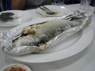 19:56 魚の塩釜 こんどは魚の塩釜。 スズキの仲間だと思うんですが、詳細は不明。 大きさは30センチぐらいで、お腹の部分に香草を詰めてアルミホイルで包んで焼いてあります。 白身の魚で、味は淡泊で美味しいと思いました。(お奨めです) 値段はたしか150THB(約500円)くらい。 エビなどは対輸出品目と言うこともあって比較的高いですが、魚は安上がりですね。 |