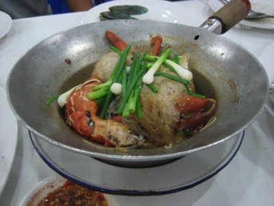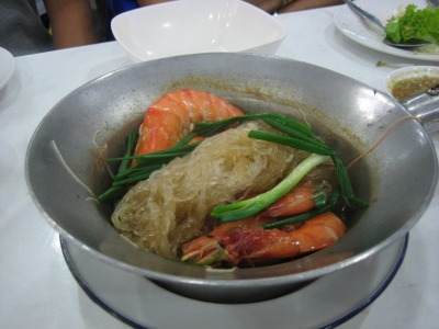 20:42 クンオプウンセン こっちはサービスで出てきた、エビの春雨煮。 クンはエビで、ウンセンは春雨のことらしい。 では”オプ”は?(わからない) 味付けは上の蟹の春雨煮と同じ、両方とも殻付きなので、手でばらさなければならず、手がベタベタになります。 以上、4人で食べて全部で2,000THB(約7,000円)弱でした。 |