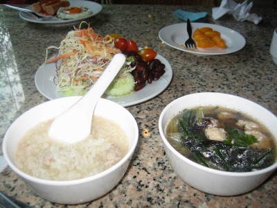 朝食は洋食もあるのですが、今朝は鳥粥に肉団子と野菜のスープ、それに生野菜。