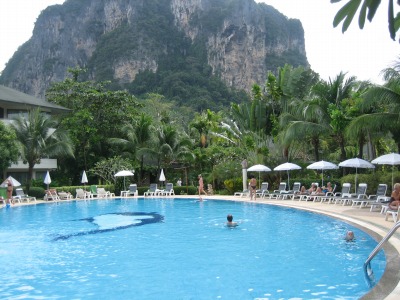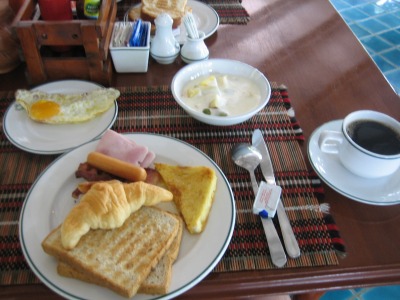 10:00 タイ旅行も後半、6日目の朝です。 今朝は昨日移ったゴールデンビーチリゾートで朝食を取ります。 流石に今までのホテルと違い、朝食も充実しています。 タイ料理もありますが、今日はアメリカンブレックファースト。 フロアーには卵料理を作ってくれるコックさんもいて、果物もパイナップル、マンゴーなどと充実しています。 これで、1人当たり1泊7,000円と、東京のビジネスホテル並の金額ですから、物価の格差を感じます。 今日はイベント事は何もありません。 普通の休日と一緒、ただタイのクラビと言うリゾート地にいるというだけ。 レポを読んでくれる人に申し訳ないくらい。でも、自分としては何もせずボーっと過ごす時間はとても贅沢。 |