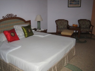 10:49 ここで、部屋の写真を。 自分たちが泊まったのはコテージではなく、普通のホテル棟です。 出来ればコテージの方に泊まりたかったのですが、おととい自分たちが予約をしに来たときには既にコテージは予約で一杯で、ホテル棟しか空いていませんでした。 雨期の終わる11月からはハイシーズンと言うことで、結構混んでいるみたいです。 部屋はキングサイズ(クイーンサイズ?)のベットで、タイでは標準的な大きさだと思います。 バスルームには、流石に4,000THBもする部屋なので、バスタブがあります。 やっぱ、バスタブがあった方が良いですね。 熱いお湯も十分に出ます。日本では当たり前ですが、安いホテルでは十分に熱いお湯が出ないこともありました。 |
