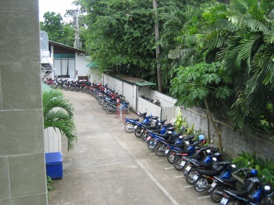 13:42 ホテルの裏の従業員用バイク置き場。 バイクの色をそろえて停めてあるので、バイクの倉庫みたいですね。 |