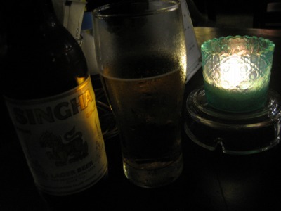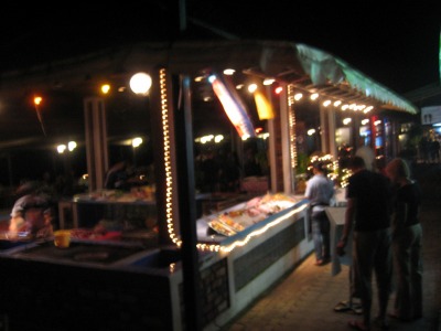 19:55 で、今度は夕食。(食べているばかりみたいですね。実際そーですが・・・) 夕食は・・・あまりお腹が空いていないんですが、せっかく海辺のクラビに来たのですから、シーフードにしました。 お店は、タイのリゾートに良くあるタイプで、店先に素材のシーフードが並んでいて、好きな素材を自分で選んで調理方法を言うと、料理して出てくる方式です。 |