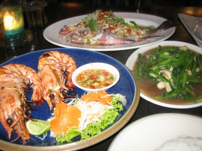 20:28 で、あまりお腹が空いていない、と言う割に、空芯菜とキノコの炒め物、焼きエビ、蒸した魚(種類不明)としっかり注文してます。(×_×) (ライスも付いてます) で、エビは25cm級の大きなものですが、調理費込みで1匹500円位した様な気がします。 (決して安くは無いような、日本の3分の2くらいかな) |