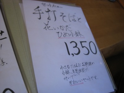 14:50 注文は 自分はセットメニューの花いかだひめ小鉢を、蕎麦を大盛りで頼みました。(¥1,350+大盛り\200) |