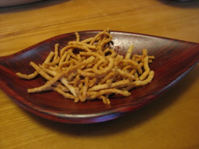 15:07 揚げ蕎麦 料理が出てくるまでの、箸休め(?)として蕎麦を打ったときに出る端っこの短いところを揚げた揚げ蕎麦。 ポリポリとつまみ出すと、止まりません。 で、おかわりしちゃいました。(^-^) |