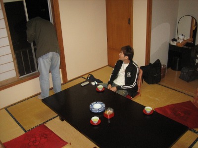 18:29 すでに 自分たちが風呂に行くときにアイスエイジさんも到着ずみです。 で、最近買い換えた携帯が言うことを効かないので、まるえさんがセッティングをしている絵。 |