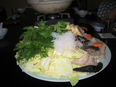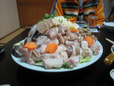 18:49 いよいよ で、いよいよ、今日の否。今回の旅行のメイン、”アンコウ鍋”。 野菜たっぷり! じゃなくて、反対側はアンコウがたっぷり。 アンコウは”身”の部分に”キモ”、”皮”そして、初めてお目にかかりました”胃袋”などです。 |